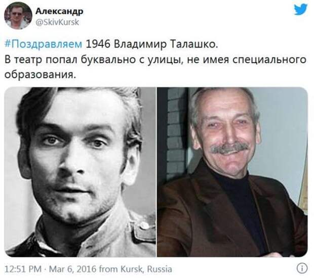 Володя Окунев в «Как закалялась сталь», старший лейтенант Скворцов в легендарной картине «В бой идут одни “старики”», Нэд Ленд в «Капитане Немо», милиционер Басаргин в «Рожденной революцией». Роли Владимир Талашко всегда играл героические. Собственно, он и мечтал с детства стать героем. 6 марта …